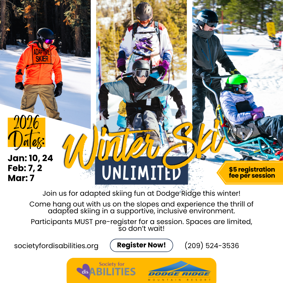 All ski trips are held at Dodge Ridge Ski Resort. The Society for disABILITIES DOES NOT provide transportation for this program to Dodge Ridge Ski Resort.