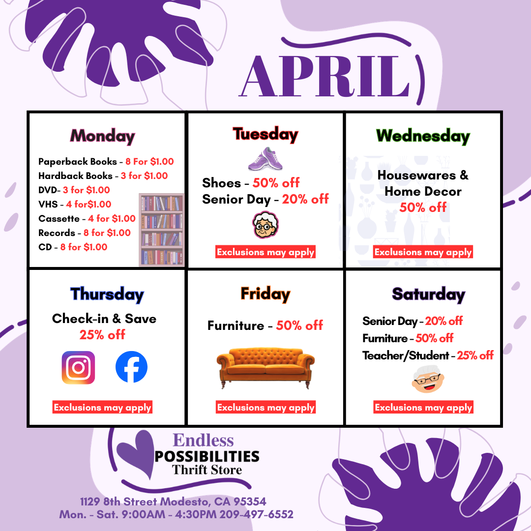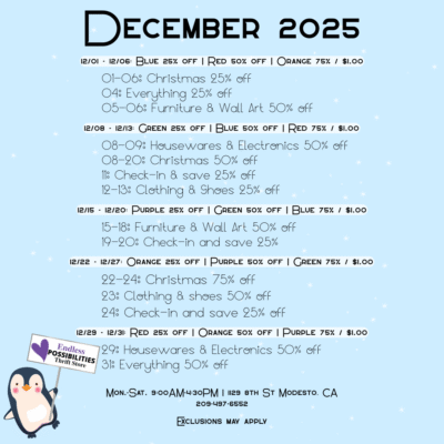 Society for disABILITIES operates a thrift store in downtown Modesto. Recognizing the need for affordable clothing, furniture, and housewares items; the thrift store opened in November of 2010 at 1129 8th Street in downtown Modesto.